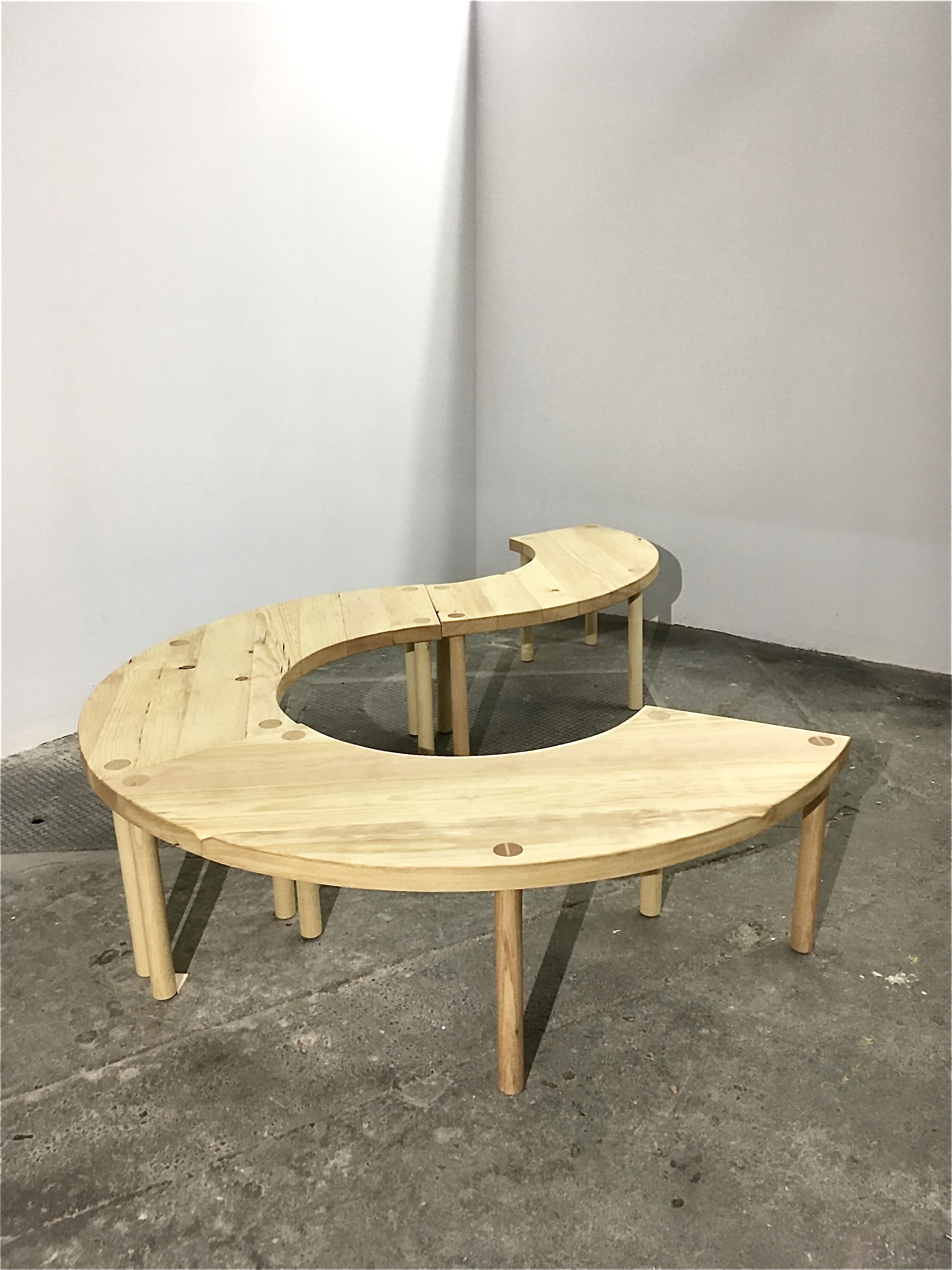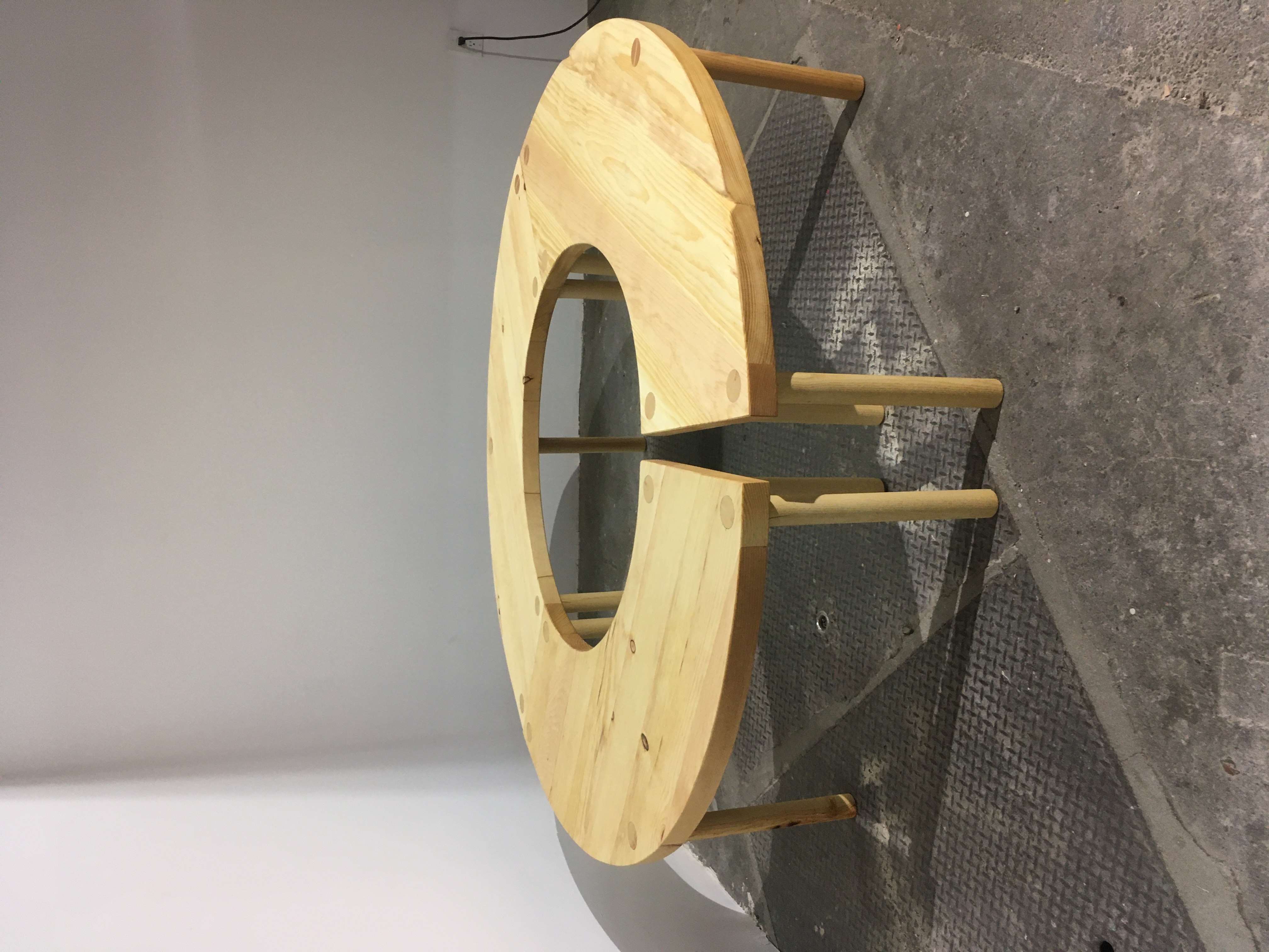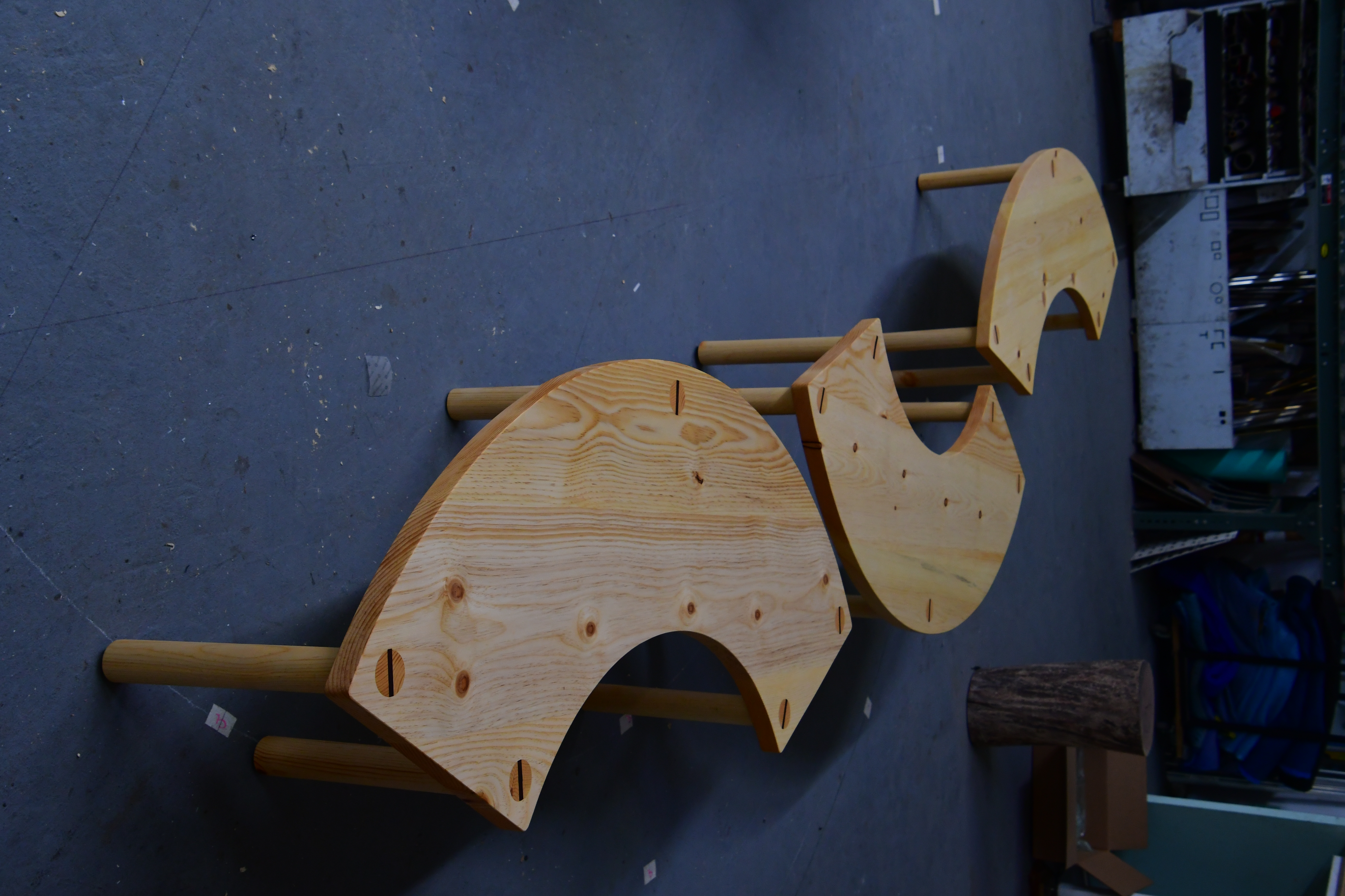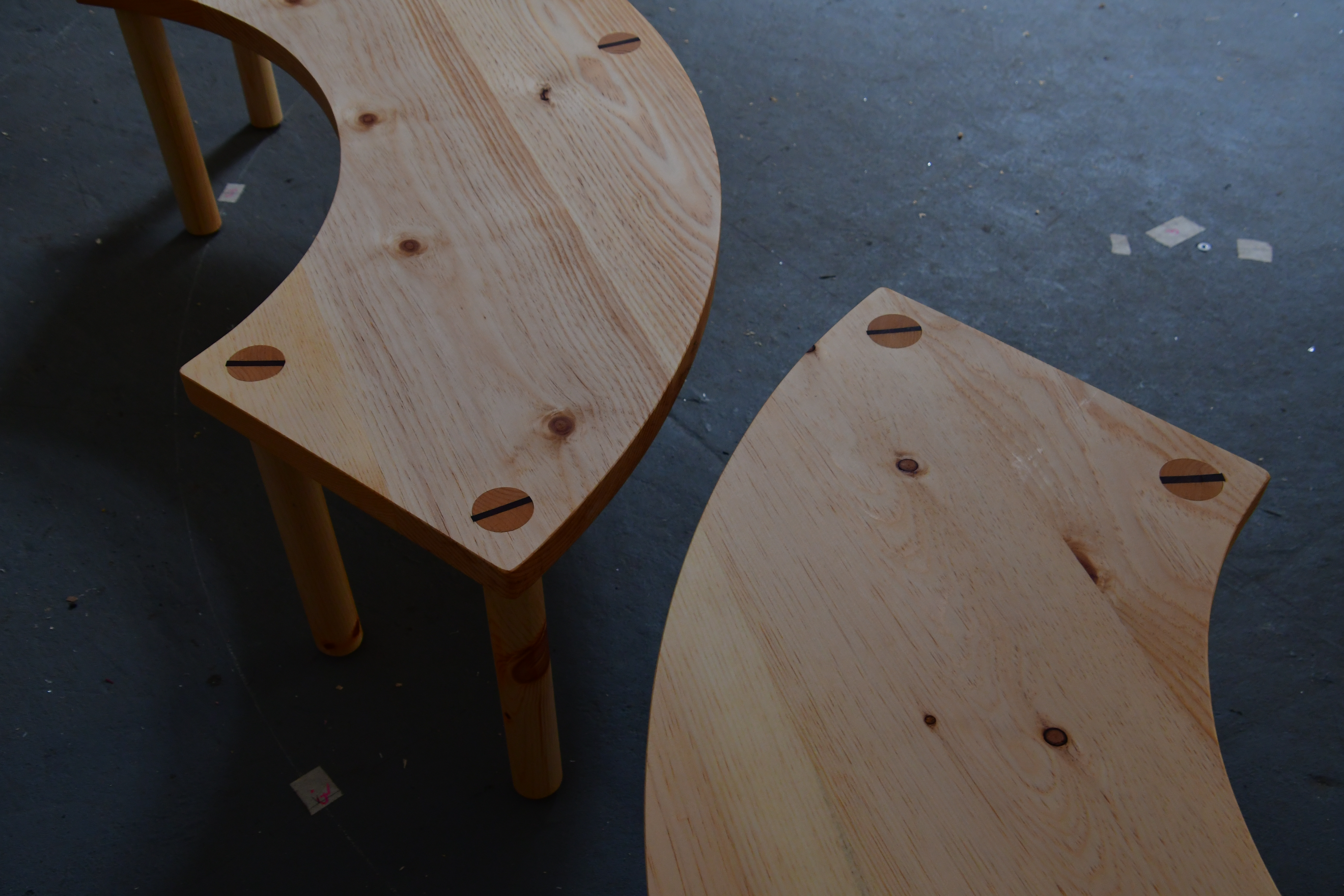 To get the shapes and sizing just right, I carved prototypes out of foam. The first batch was made on a tight budget without any large milling equipment, so the client joined me in the studio and helped with sanding. Lacking a lathe, I found a trick to shape the legs with a router, and used a large Forstner bit to cut the holes. Thanks to documentation of the process, I was able to construct the second batch four years later with refinement, tighter details and less time. Thanks to solid construction and simple design, the benches have held up with constant movement and daily use.