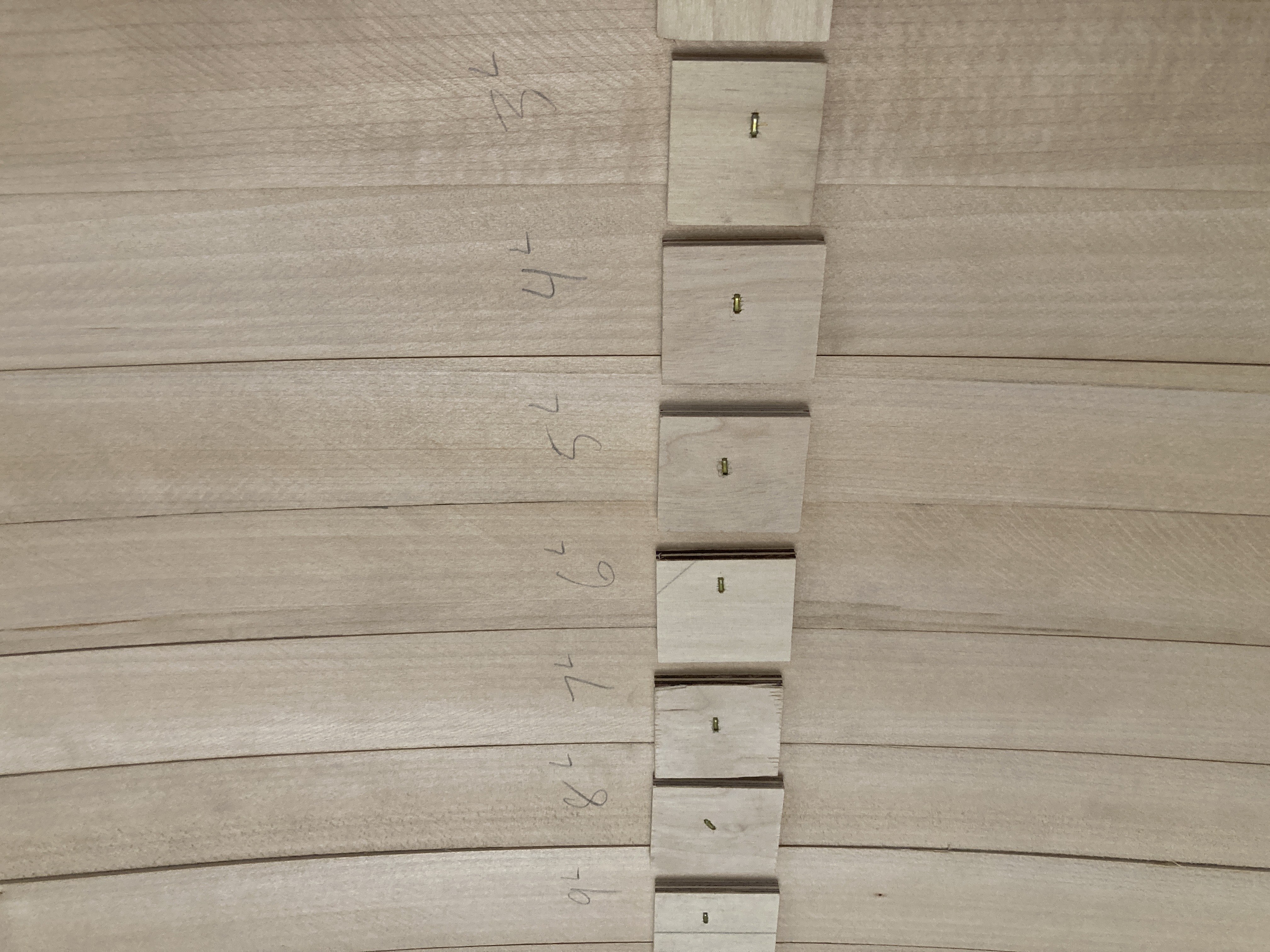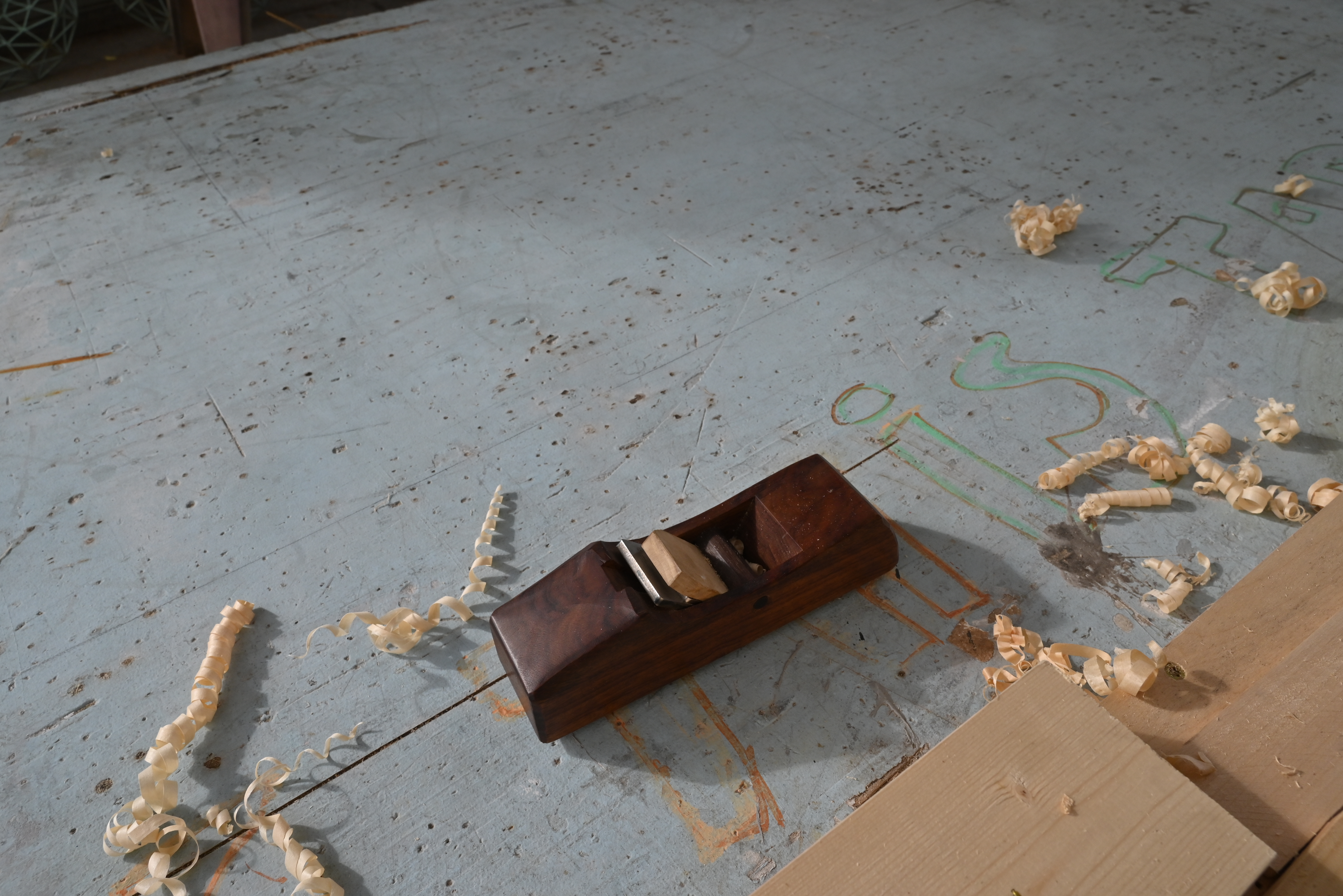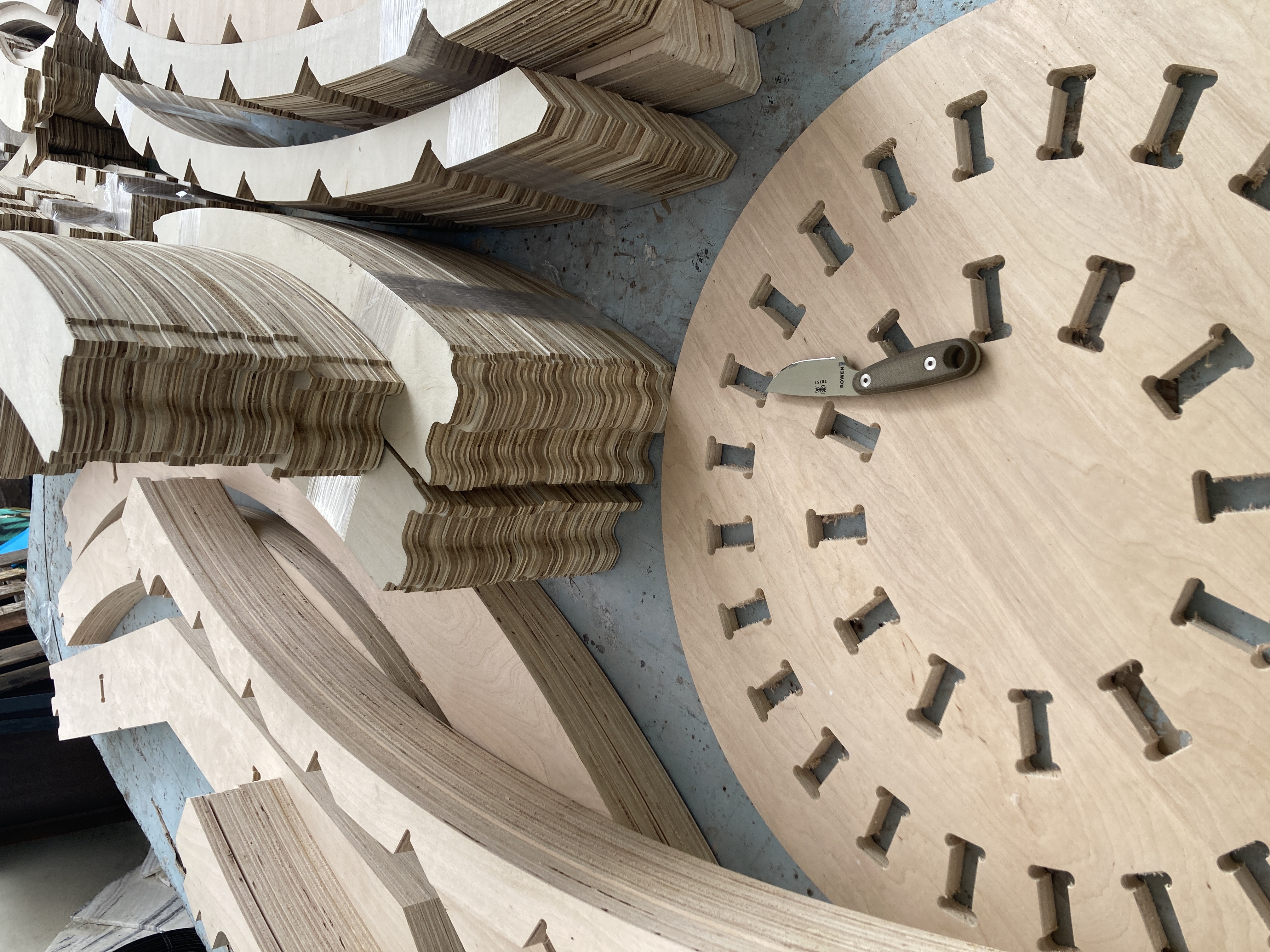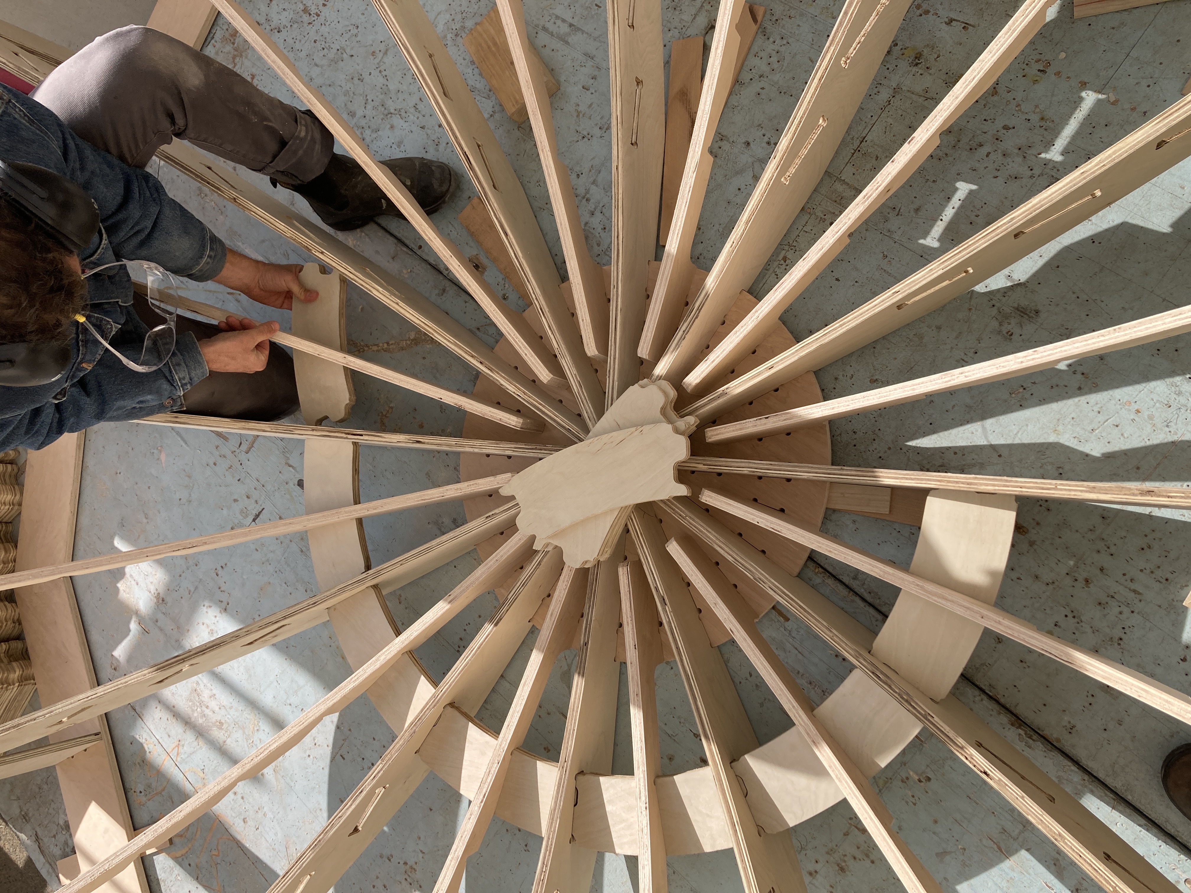 The process, although tedious at first in its requirement for precision, was incredibly enjoyable. Cara, being a skilled woodworker, was able to join us for a day of work constructing one of the layers. Since she would be carving into the finished shape during the duration of the exhibition, we removed all the metal staples used to hold the strips to the form. It took careful planning and logic to find a way to attach each subsequent layer without leaving metal anywhere within. Borrowing from the boat building world, we used low VOC epoxy to attach the layers to each other, using a total of 3 layers and 230 strips.
