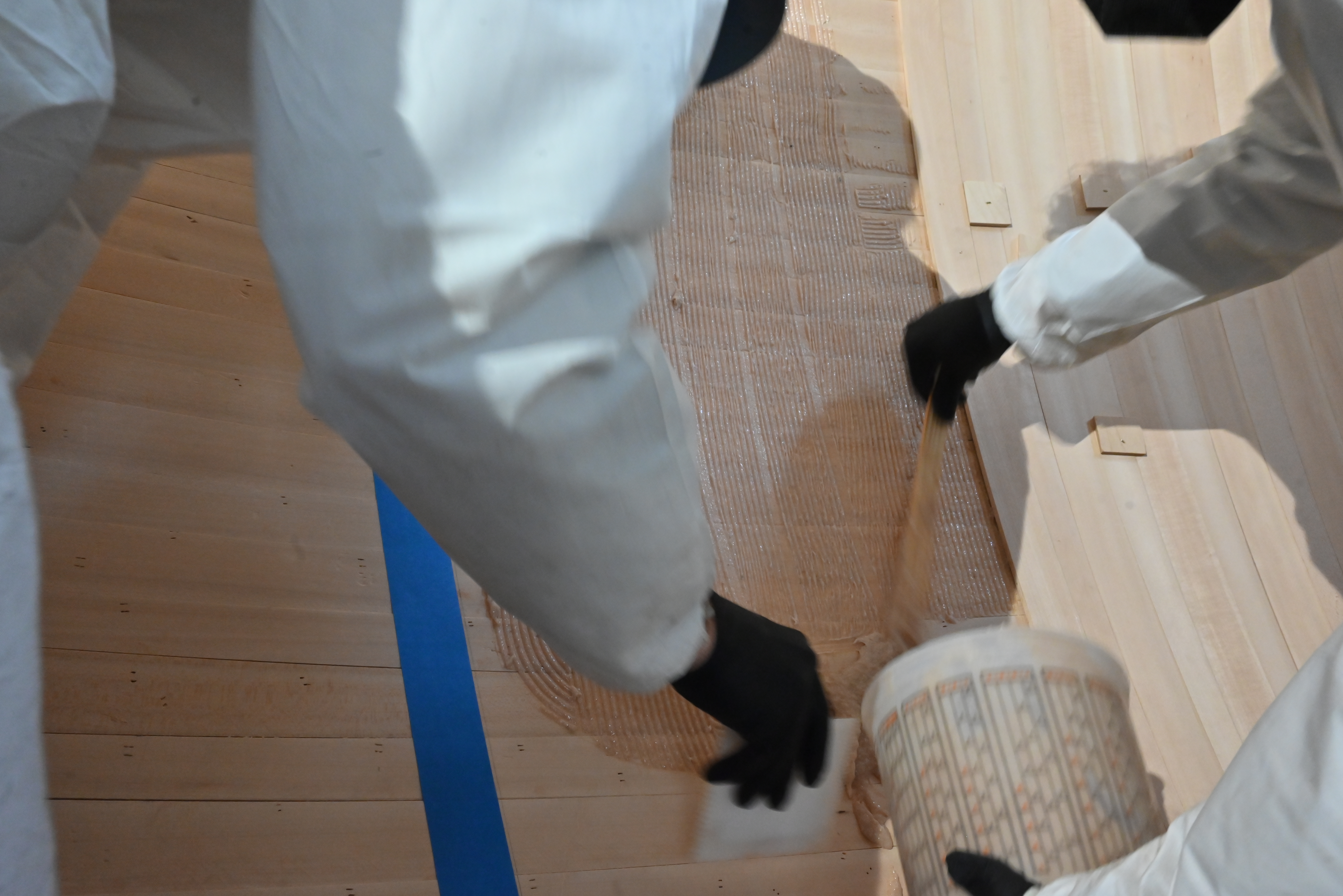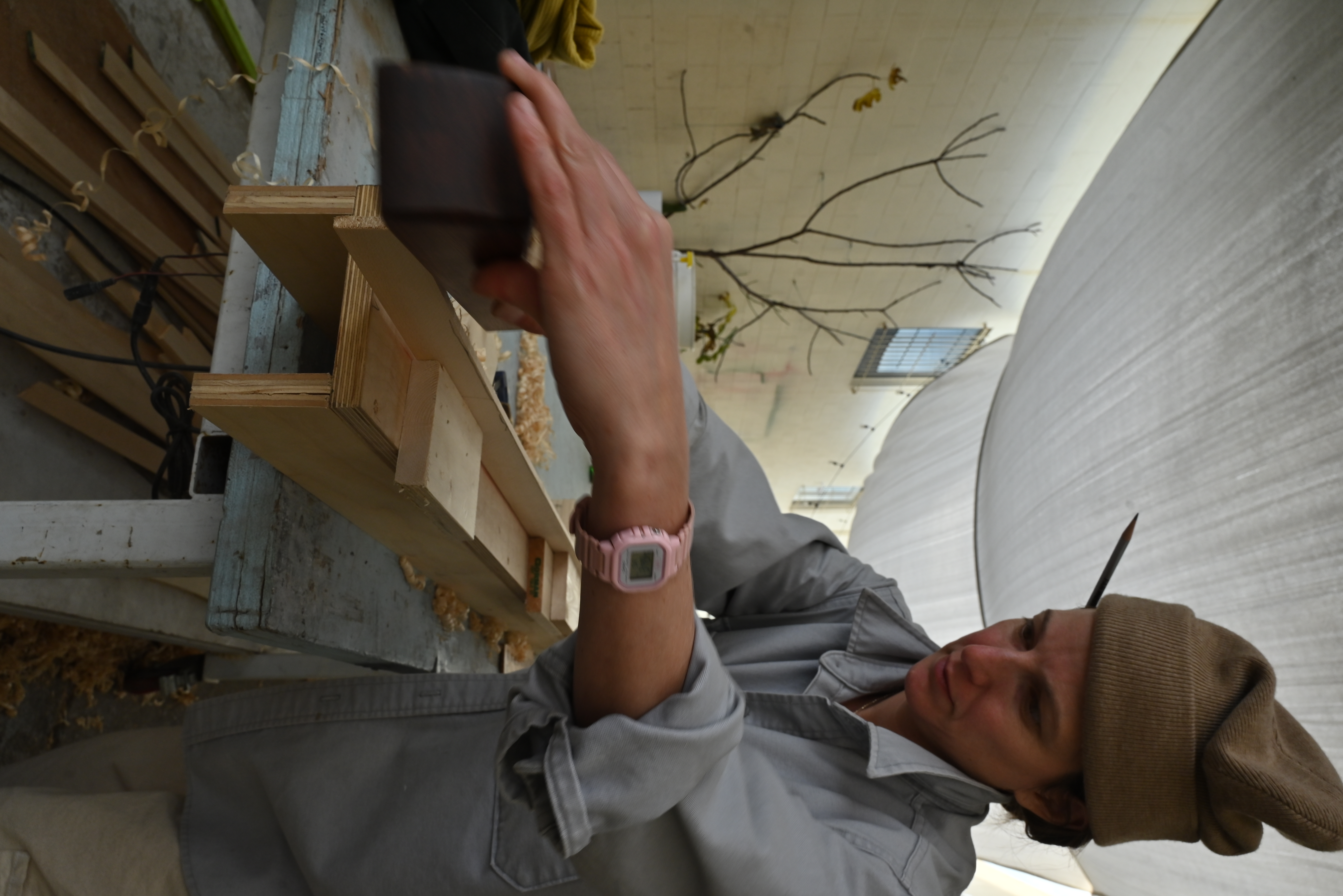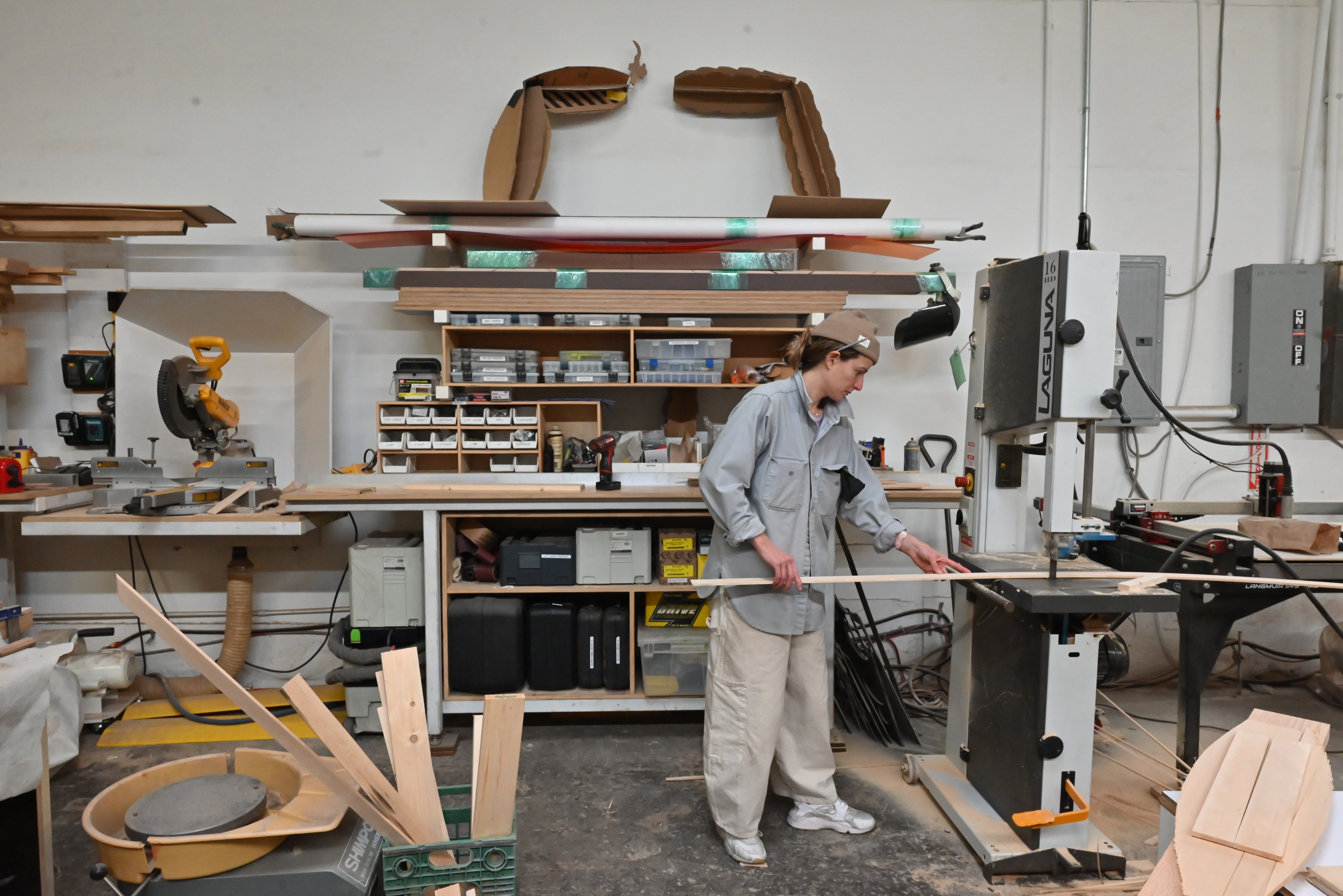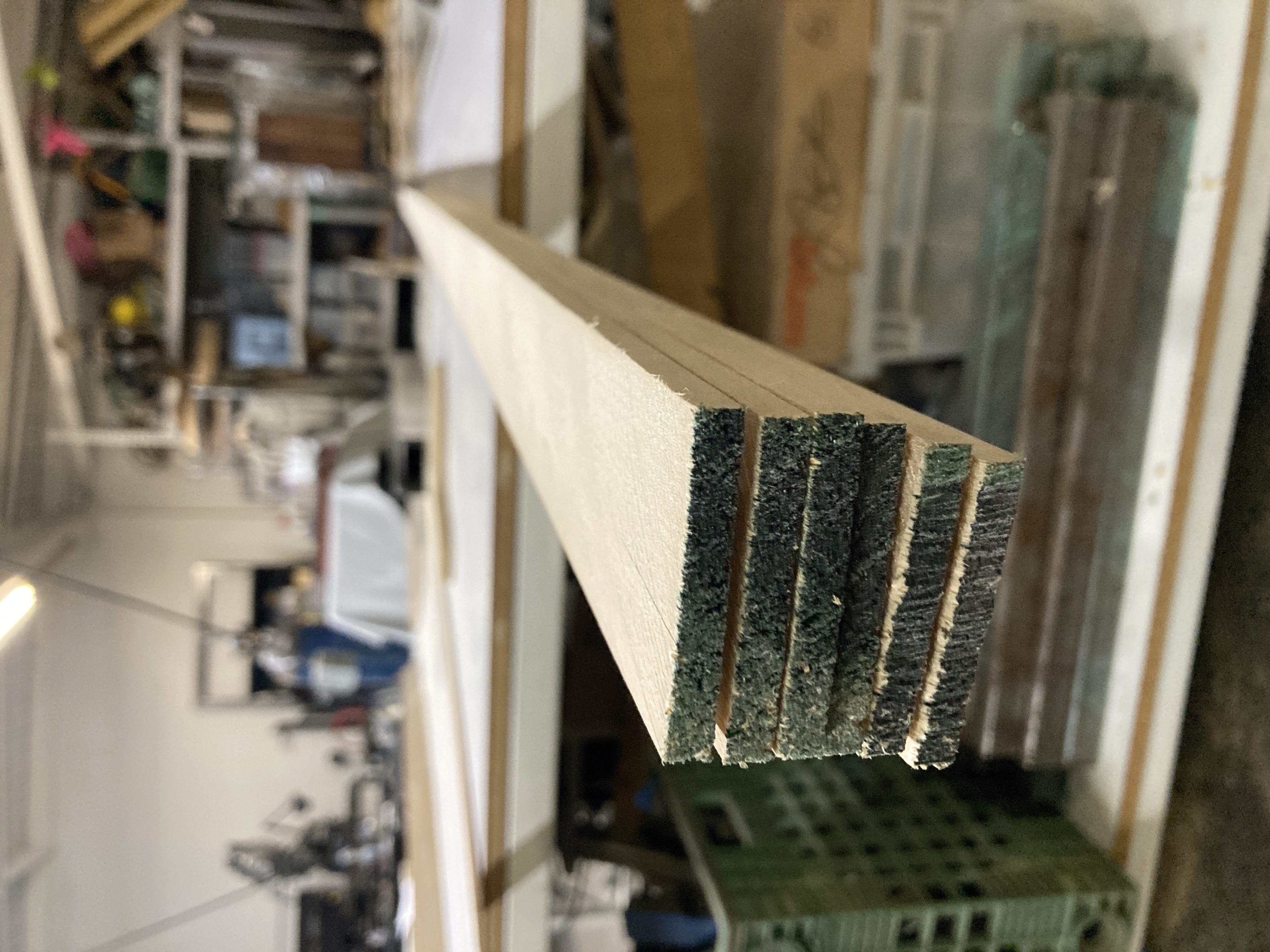 The process, although tedious at first in its requirement for precision, was incredibly enjoyable. Cara, being a skilled woodworker, was able to join us for a day of work constructing one of the layers. Since she would be carving into the finished shape during the duration of the exhibition, we removed all the metal staples used to hold the strips to the form. It took careful planning and logic to find a way to attach each subsequent layer without leaving metal anywhere within. Borrowing from the boat building world, we used low VOC epoxy to attach the layers to each other, using a total of 3 layers and 230 strips.