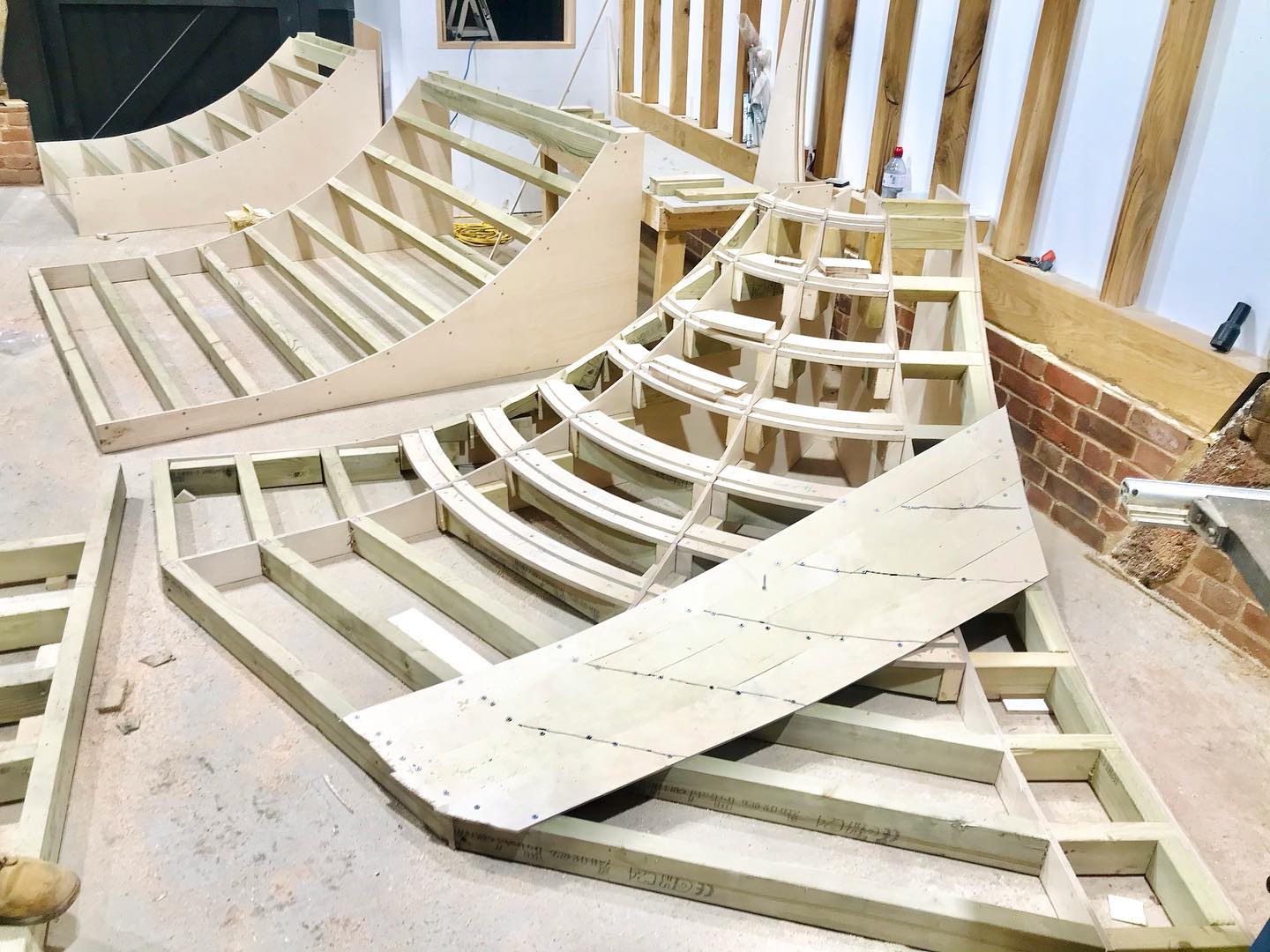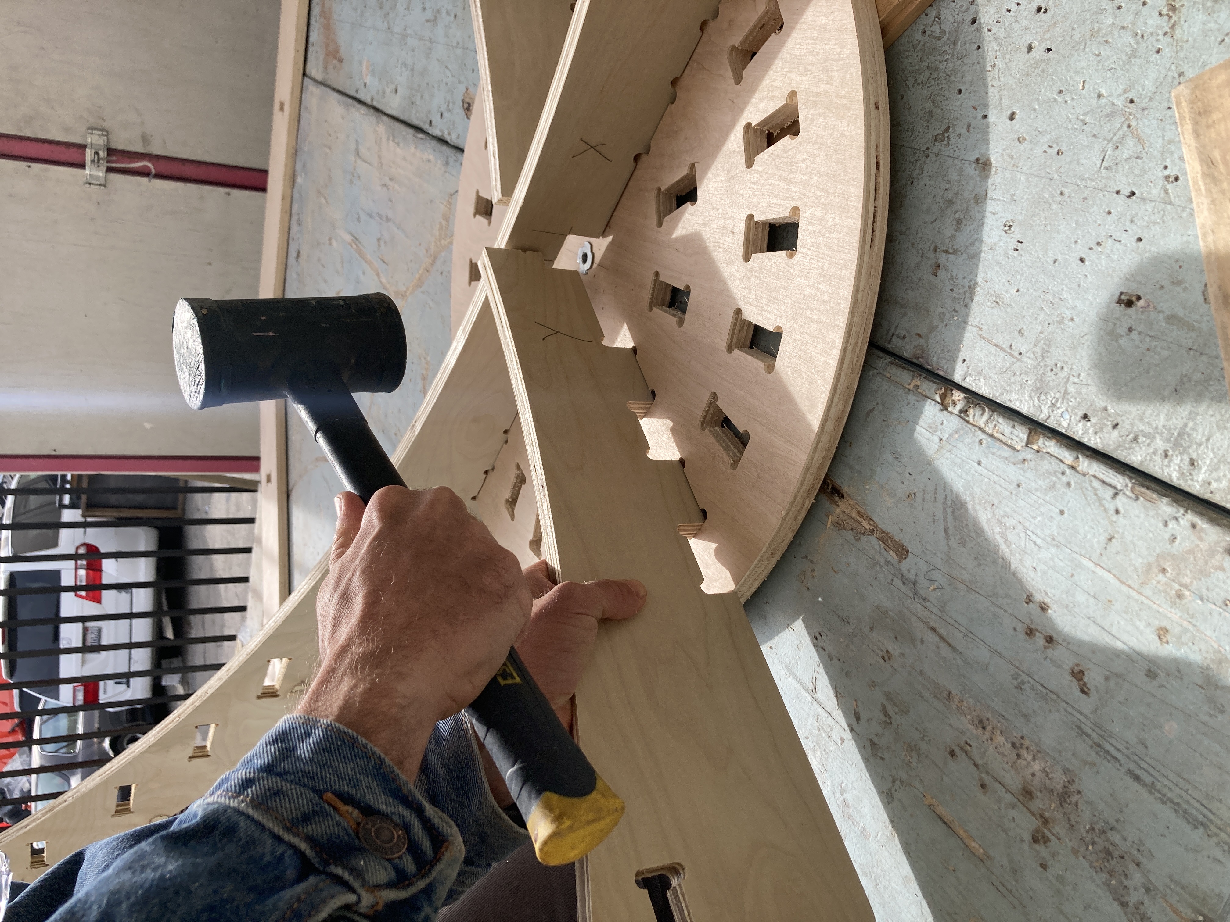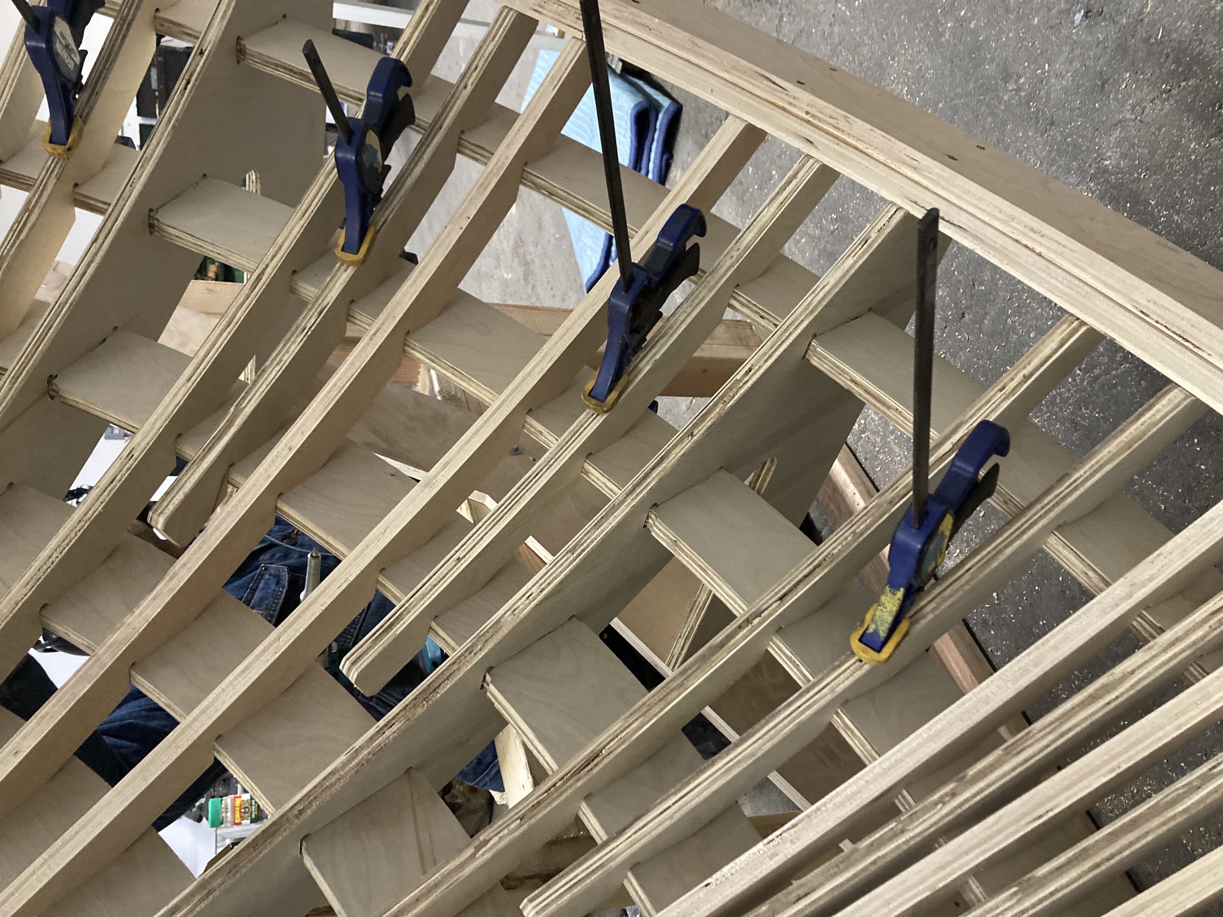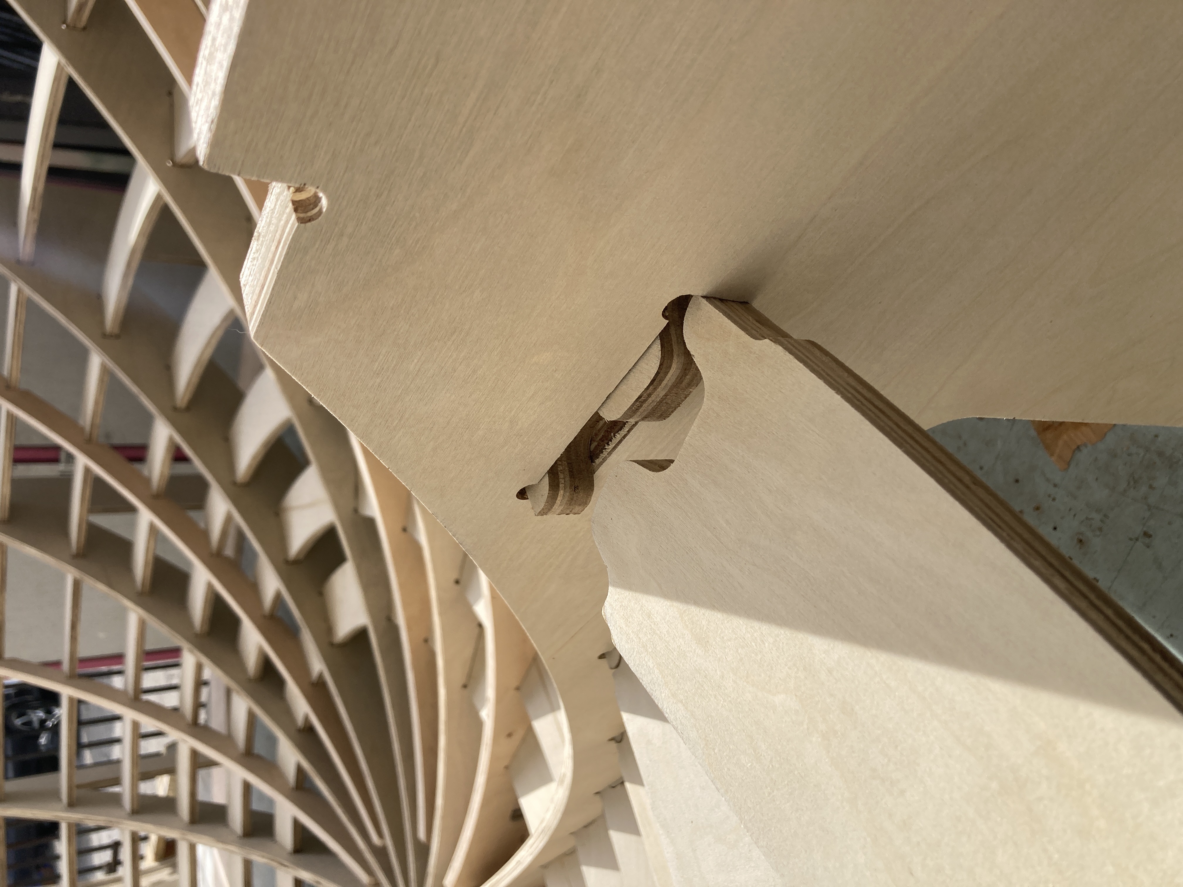 Inspired by boat building techniques and skate park construction, I designed a sub-structure/form/installation frame which was cut with a CNC router. The large frame assembled via a number of custom clever joints, using a rubber mallet, a small amount of hardware, and only a half day of labor.