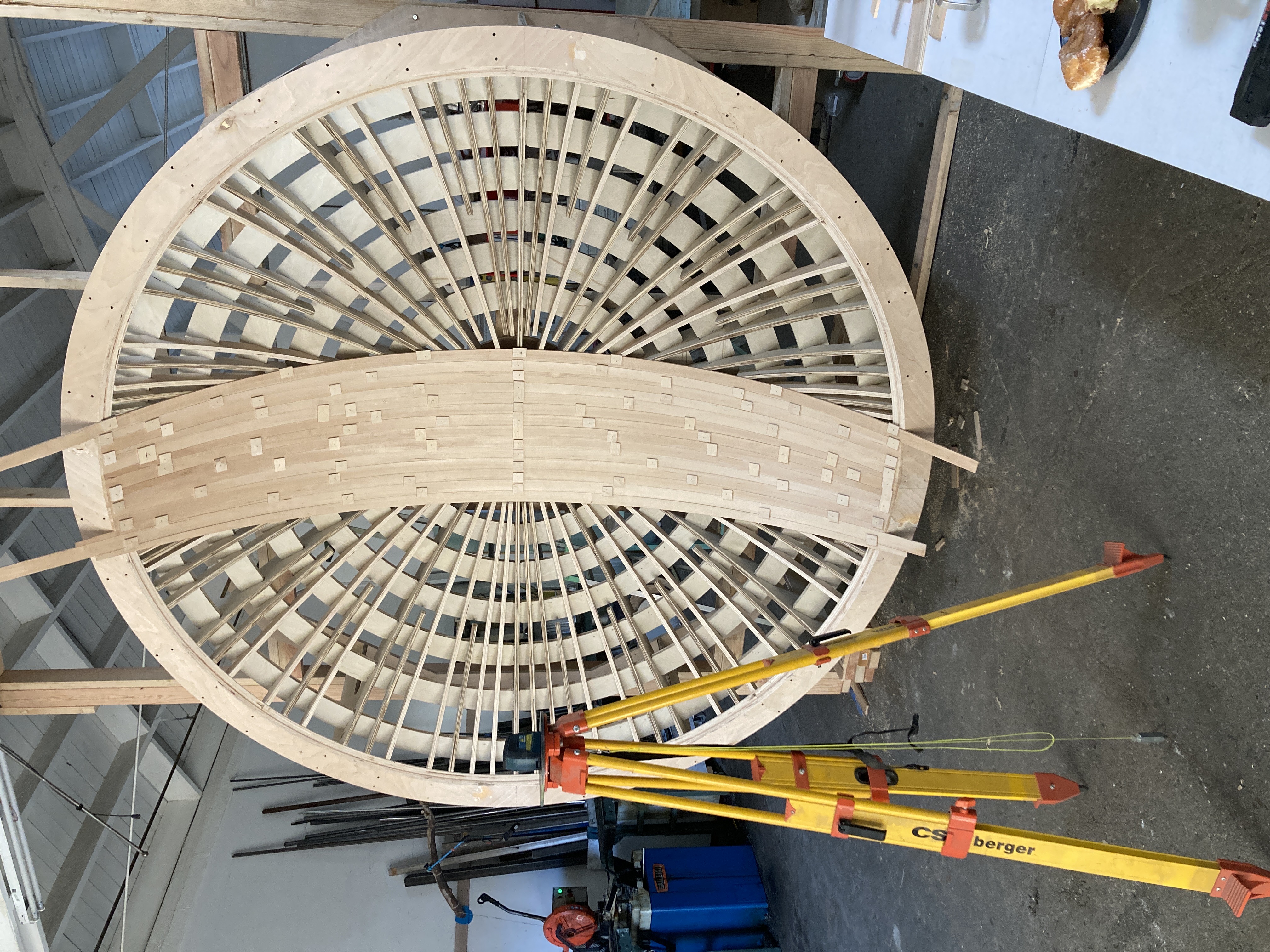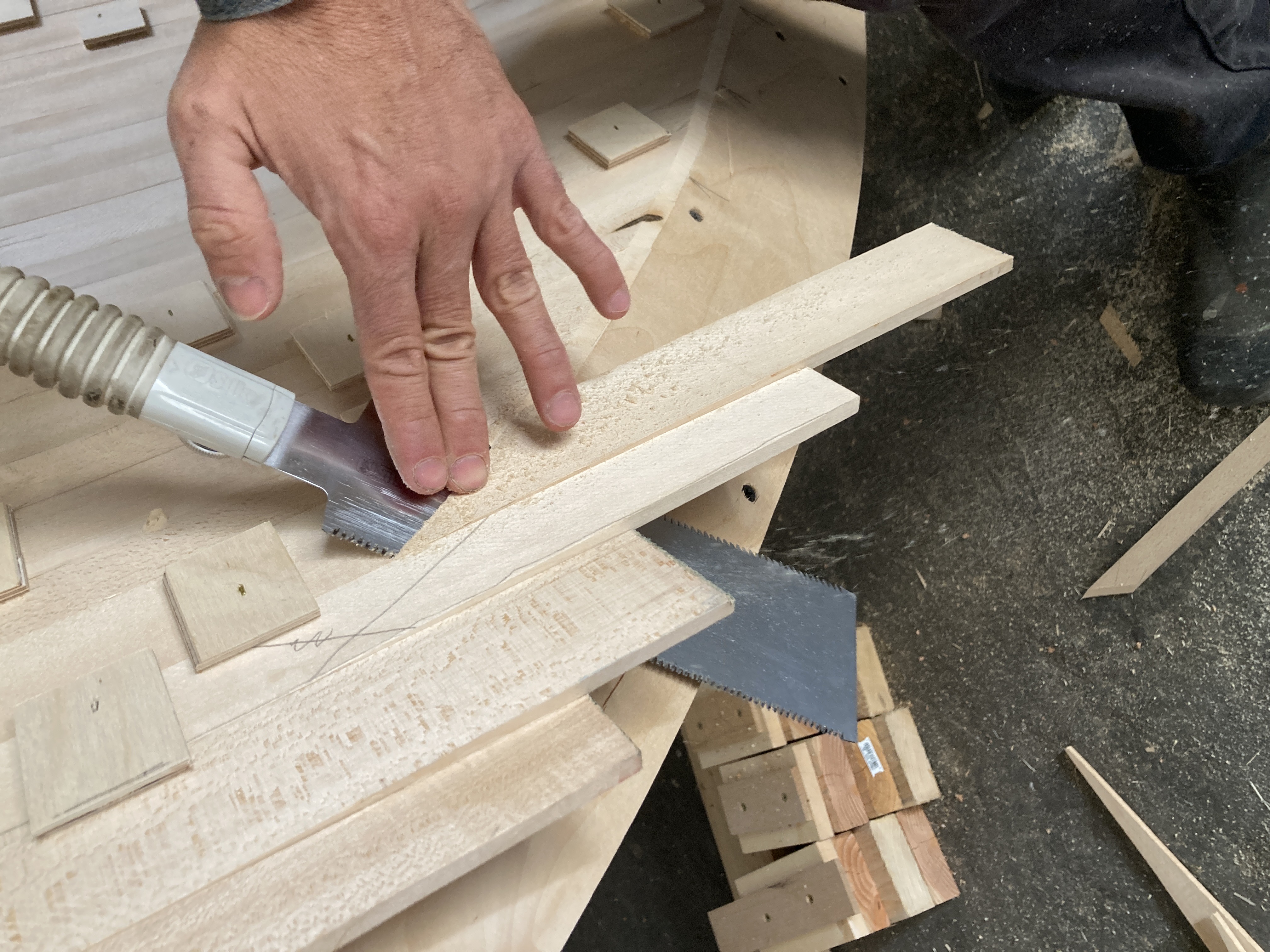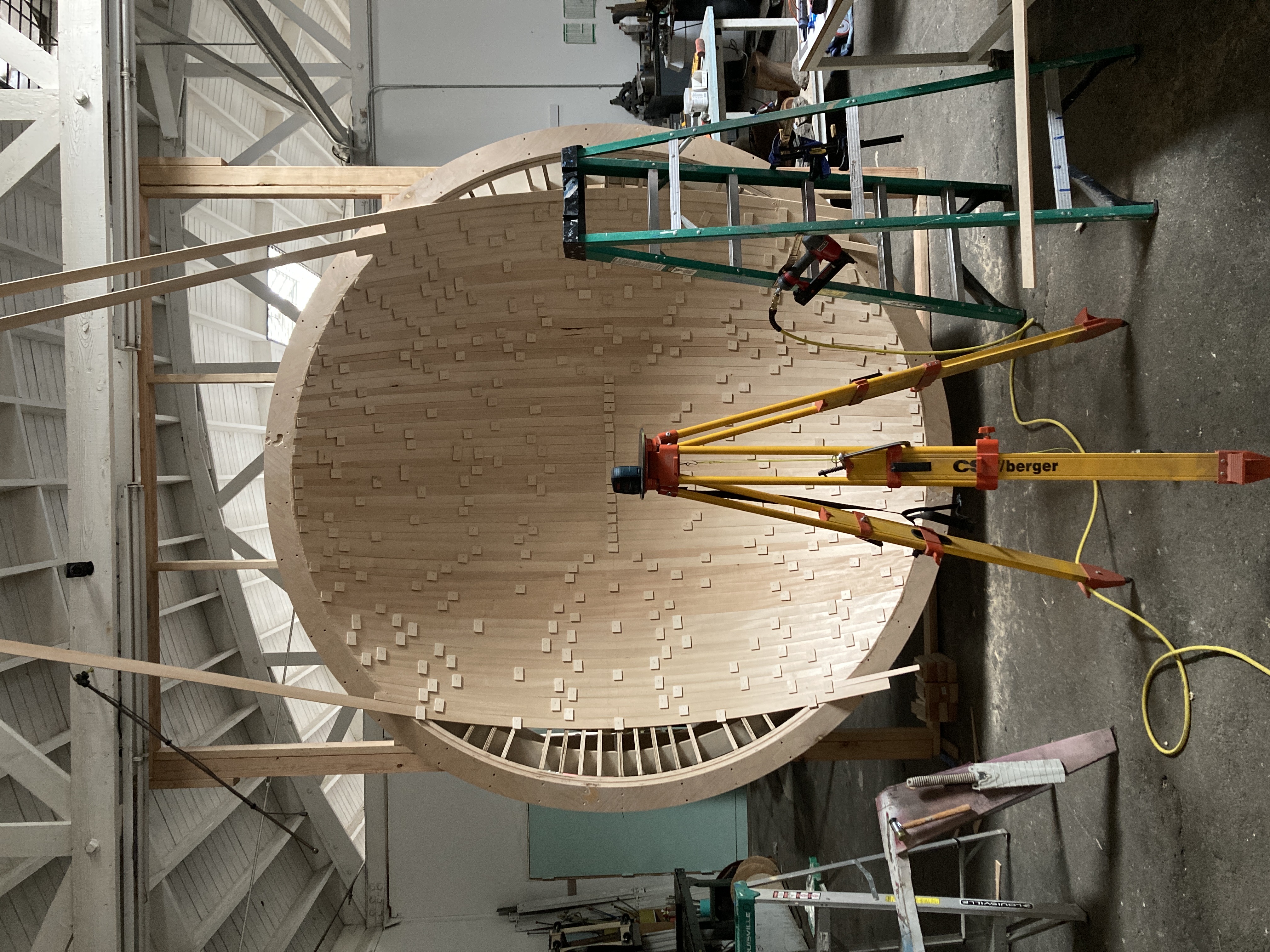 Once the frame was assembled, we built a false wall in my studio and mounted it vertically. A millwork company used special machinery to efficiently cut large boards into 1/4 inch by 2 inch strips. Using a laser-level, bandsaw and handplane, we skillfully shaped and fit the strips, temporarily nailing them to the formwork one piece at a time. Strip by strip we honed our technique, our movements and teamwork coelescing into an efficient dance. With the first layer complete, we rotated the form and started the second layer.