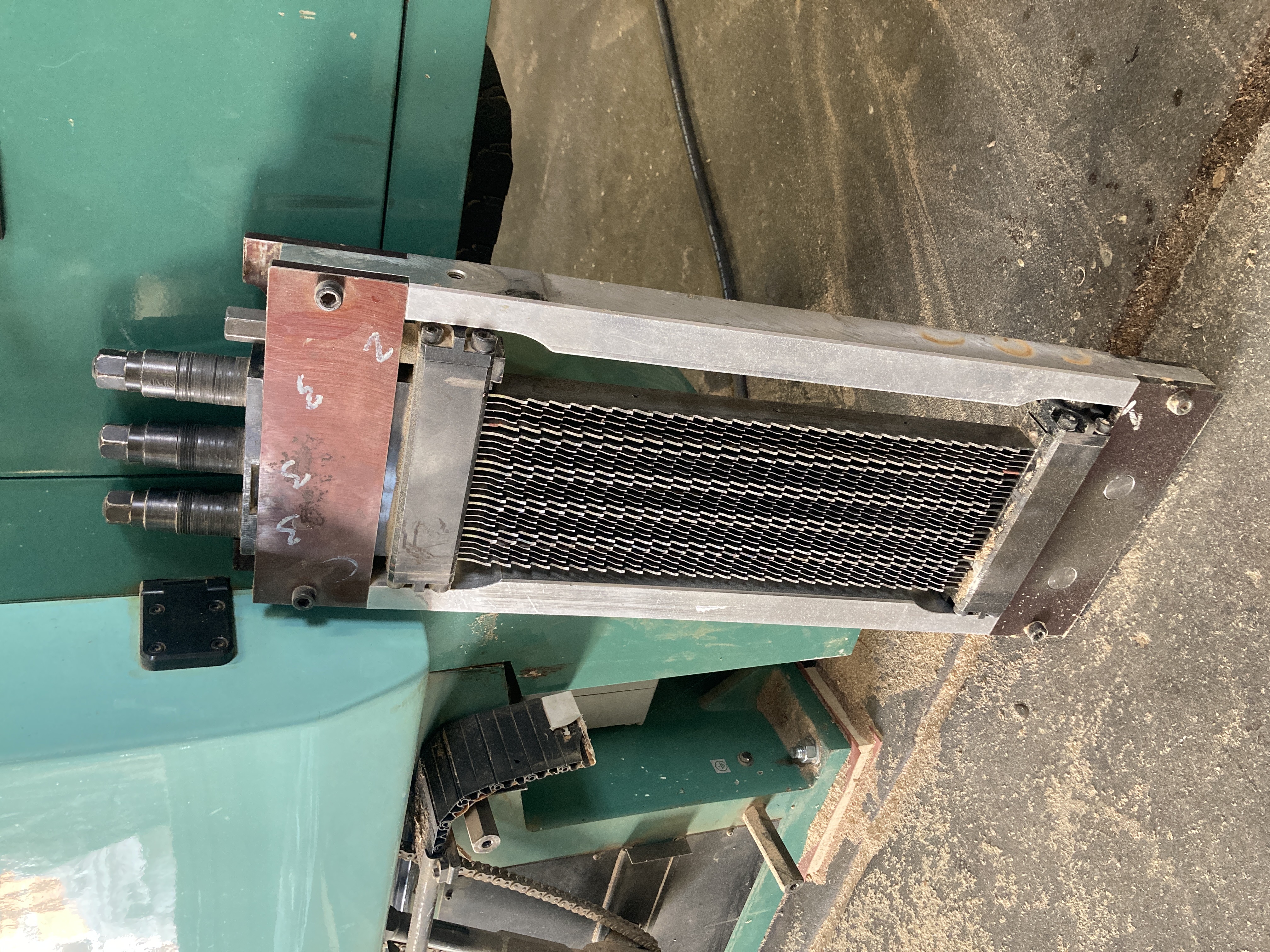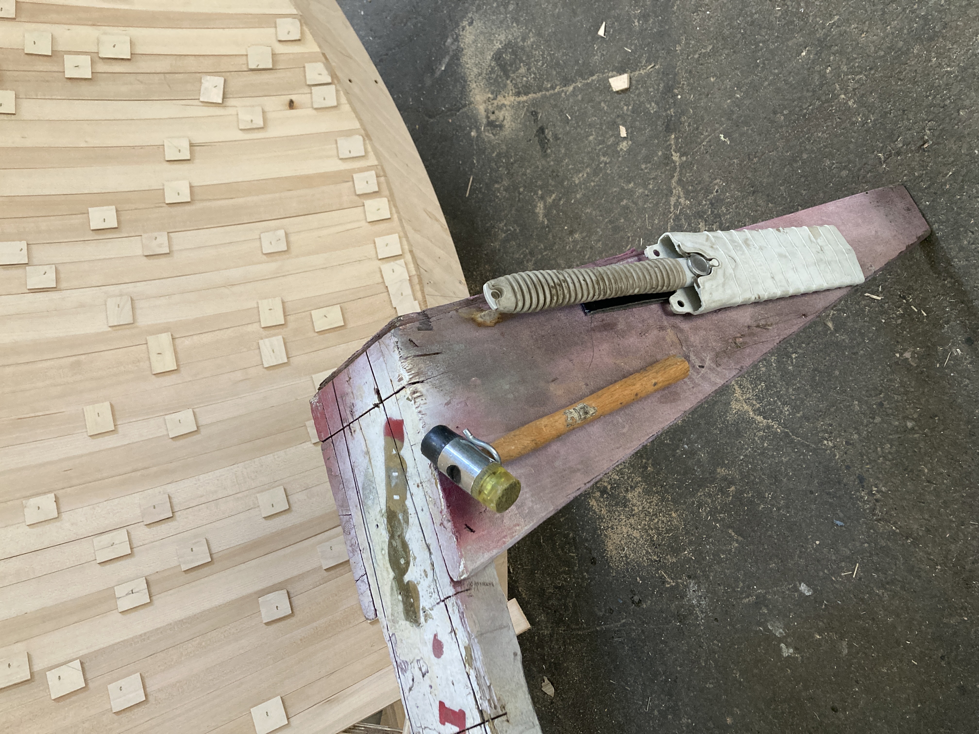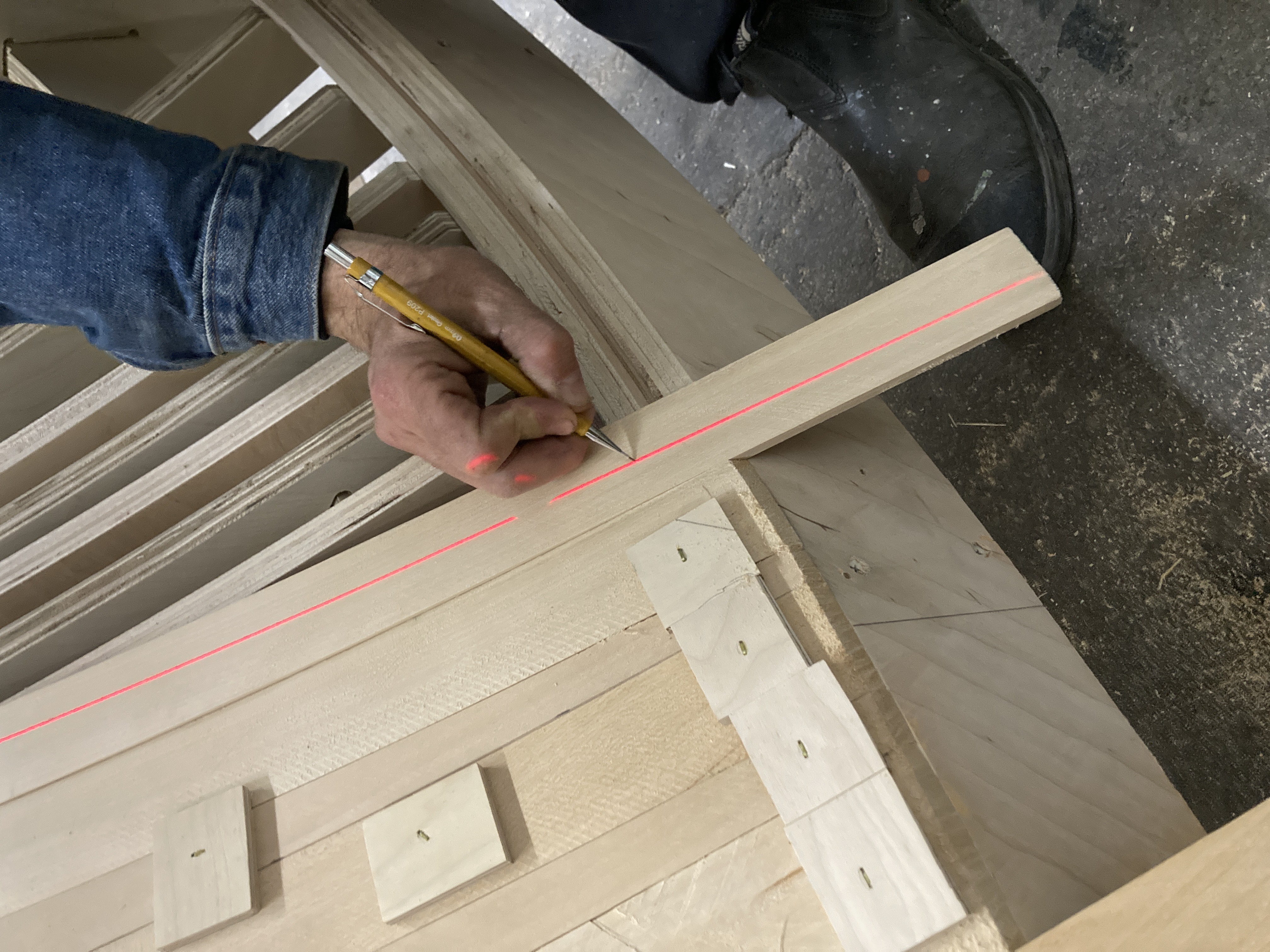 Once the frame was assembled, we built a false wall in my studio and mounted it vertically. A millwork company used special machinery to efficiently cut large boards into 1/4 inch by 2 inch strips. Using a laser-level, bandsaw and handplane, we skillfully shaped and fit the strips, temporarily nailing them to the formwork one piece at a time. Strip by strip we honed our technique, our movements and teamwork coelescing into an efficient dance. With the first layer complete, we rotated the form and started the second layer.