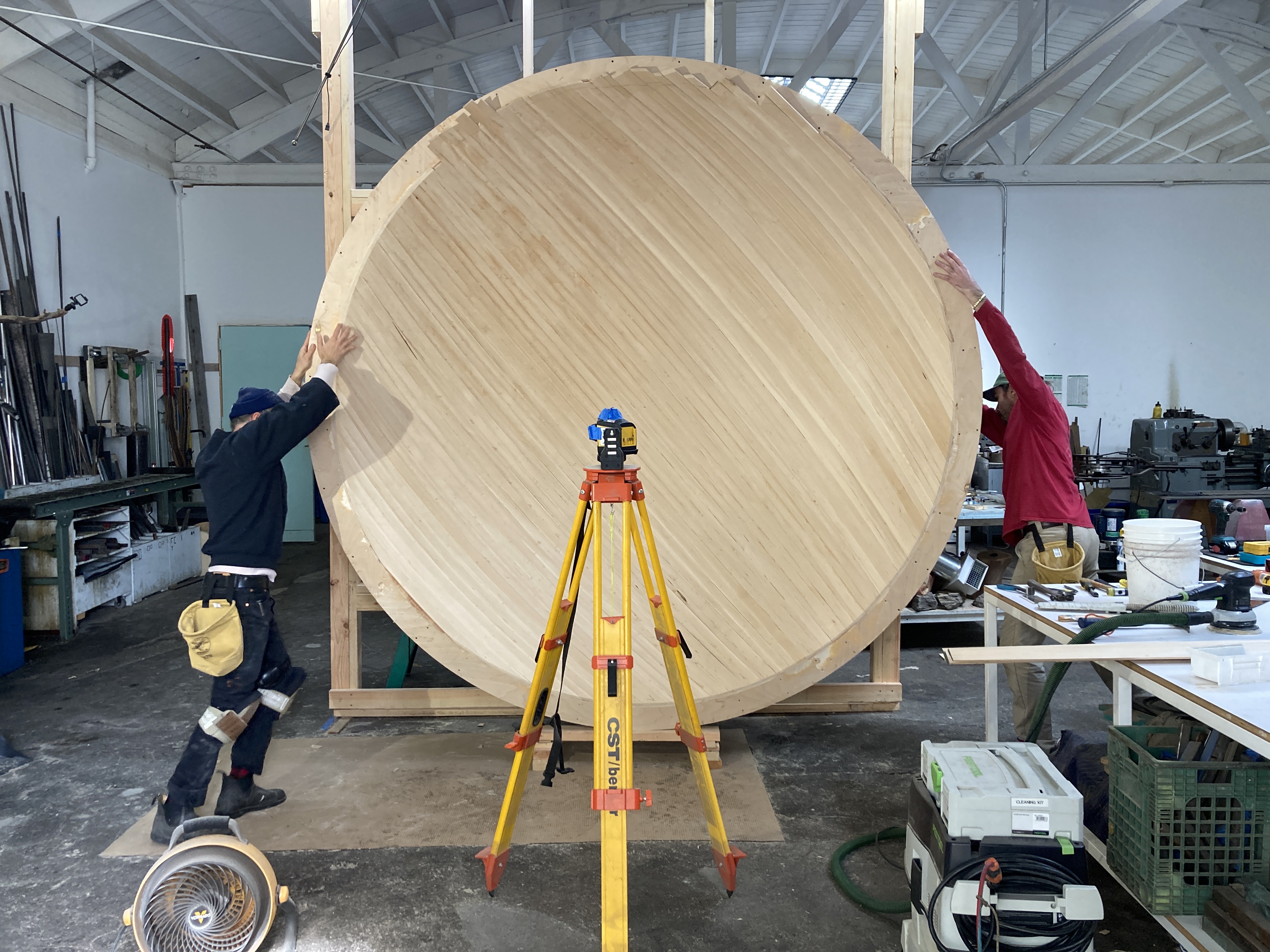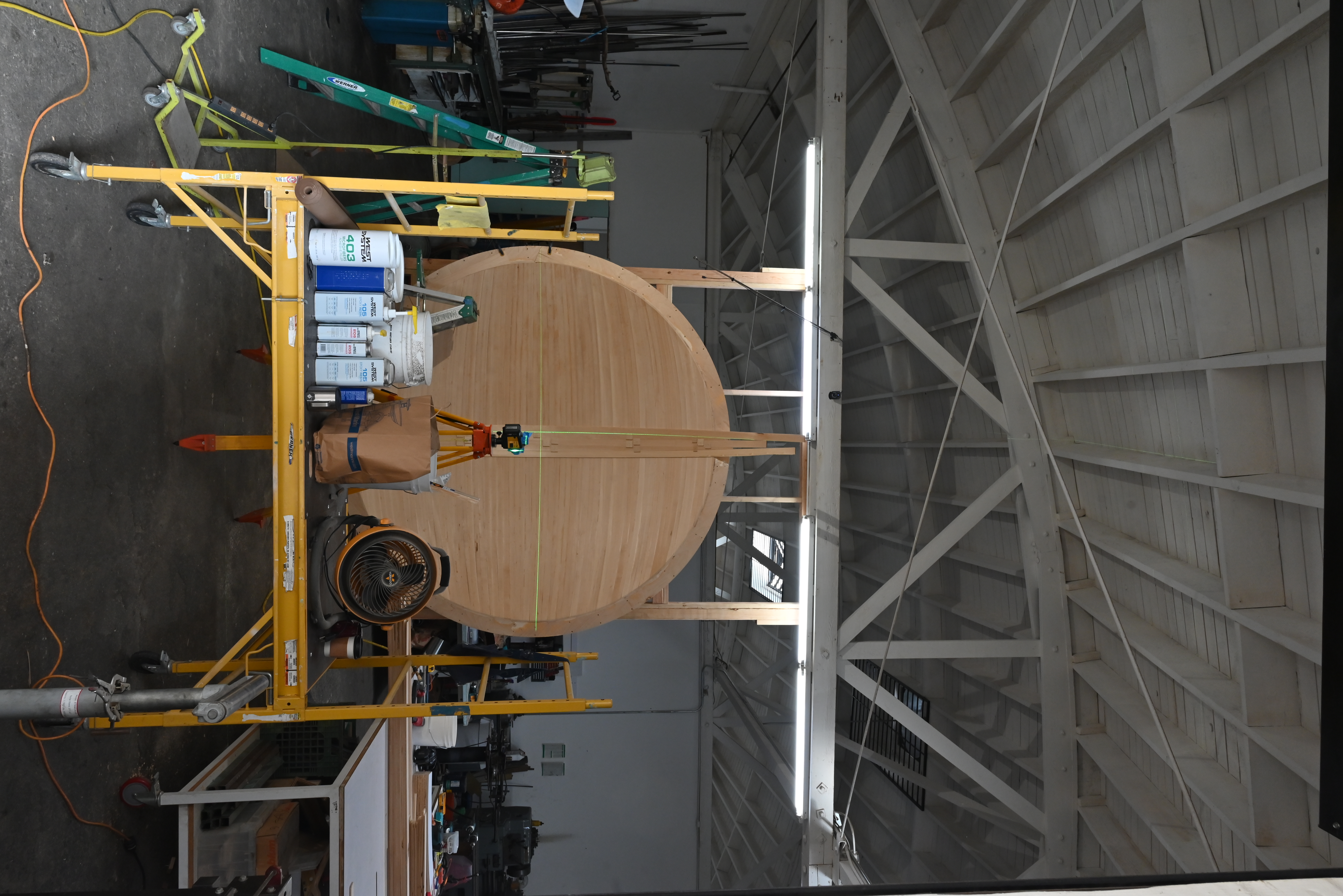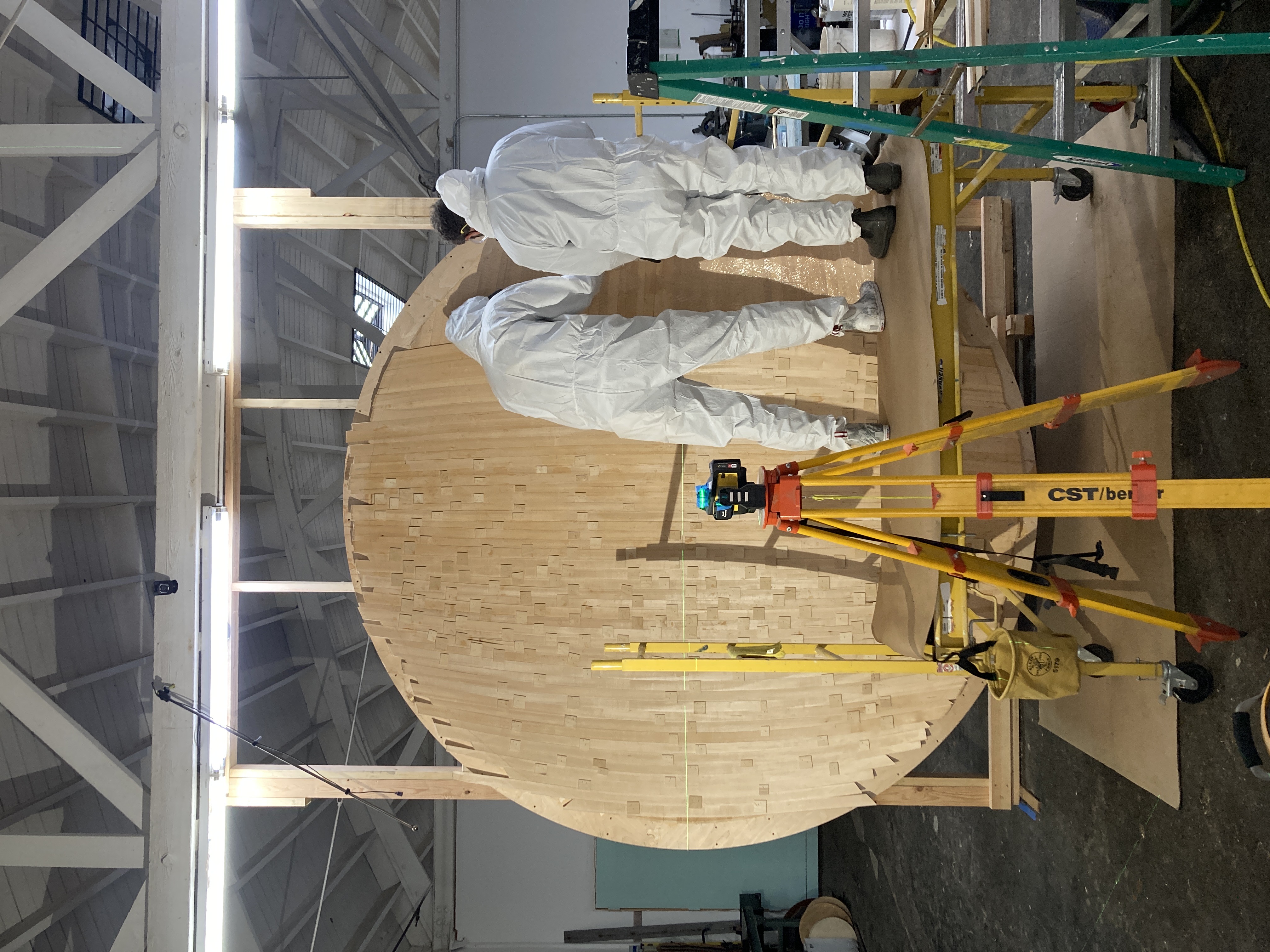 After dressing the edges, sanding and lightly finishing the bowl, we removed much of the formwork to lighten the assembly for shipping. The museum install team did a fantastic job building a false wall, circular edge and setting the form into position.