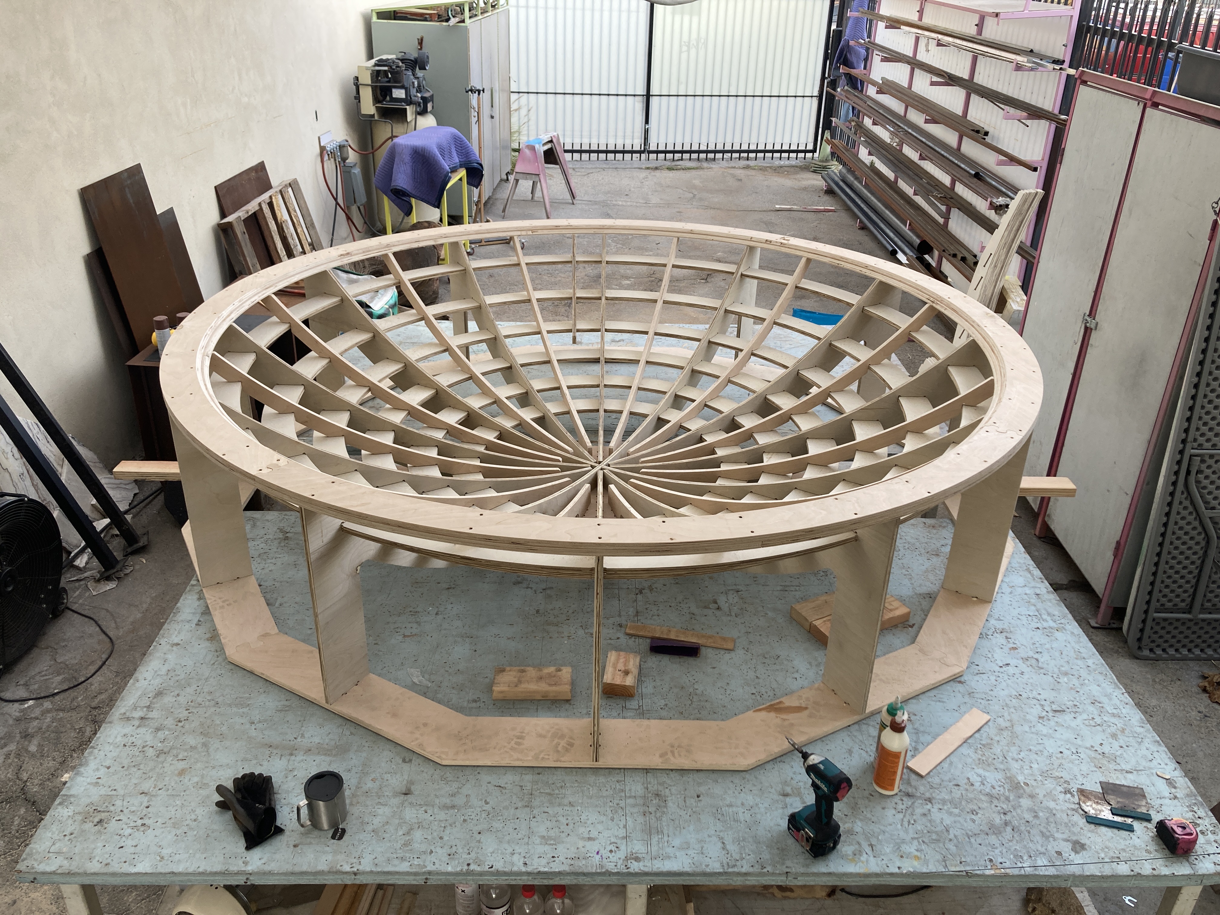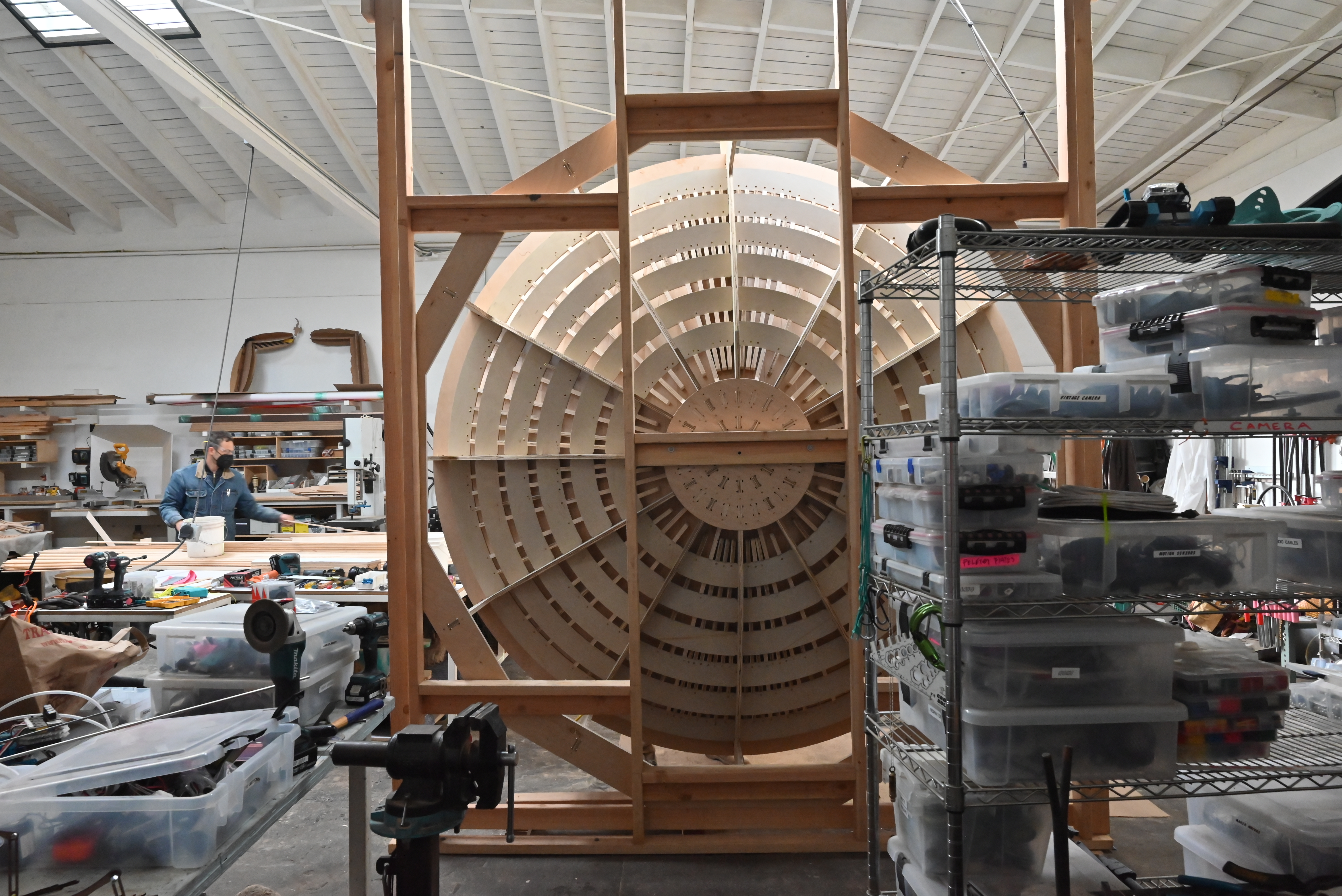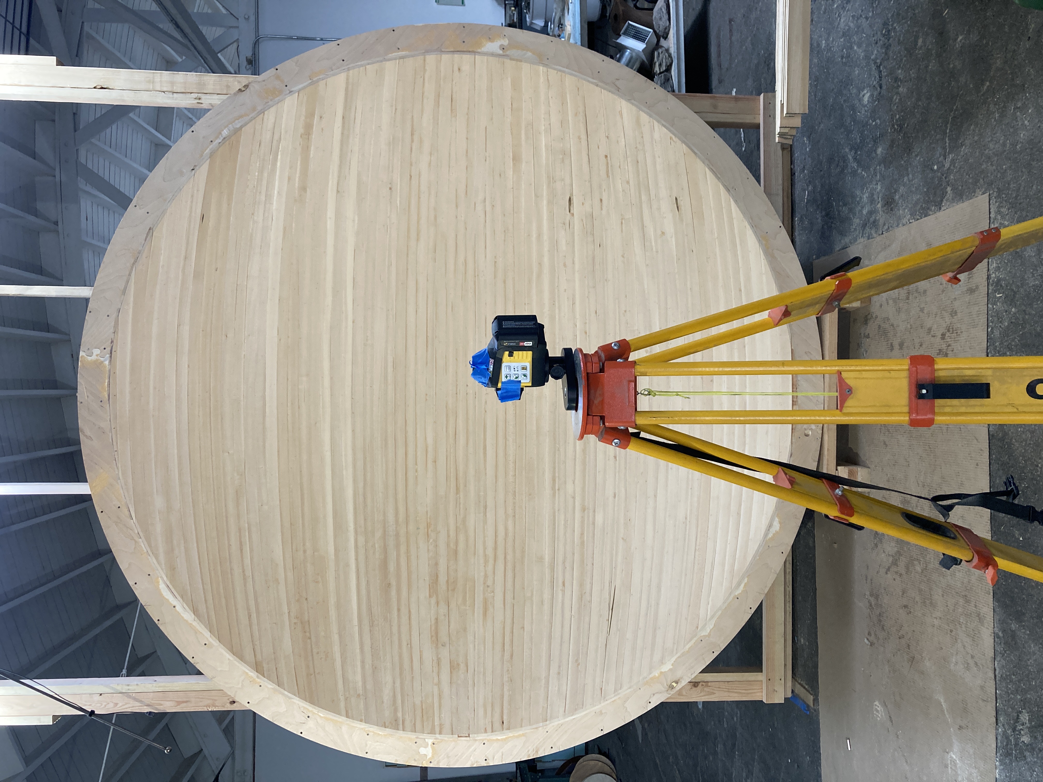 After dressing the edges, sanding and lightly finishing the bowl, we removed much of the formwork to lighten the assembly for shipping. The museum install team did a fantastic job building a false wall, circular edge and setting the form into position.