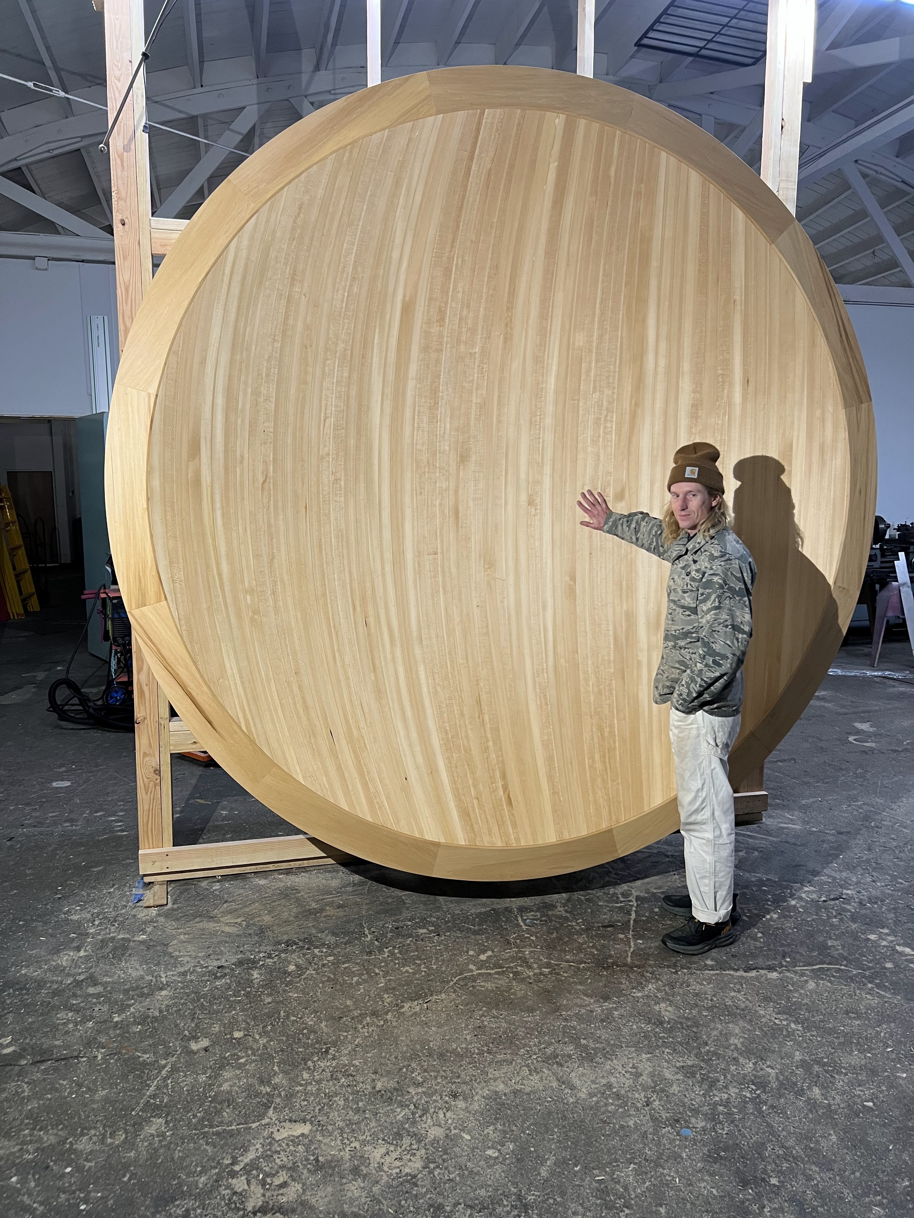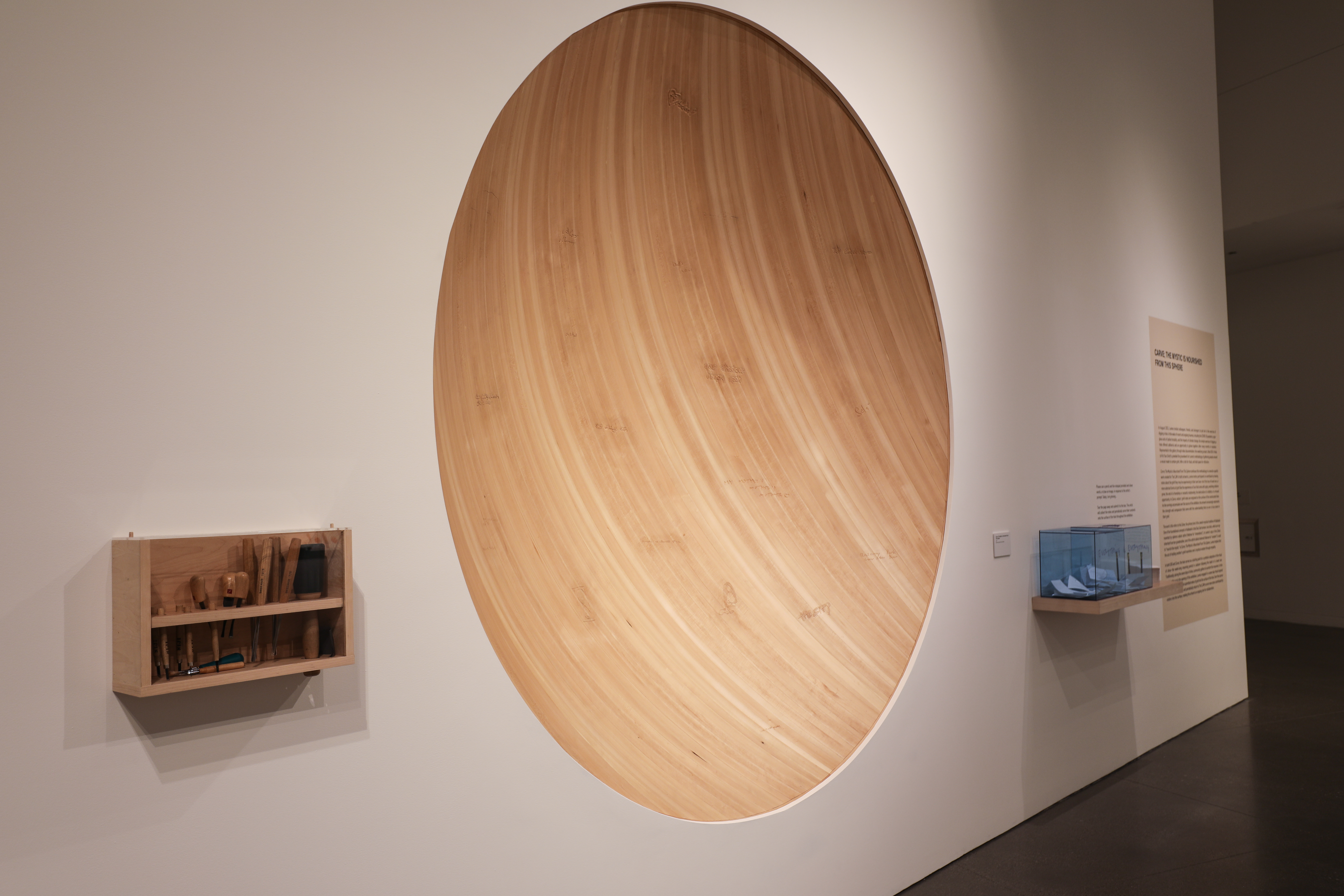 After helping Los Angeles artist, Cara Levine, design her new studio in Highland Park, she asked me to consult, design and fabricate a large artwork for her upcoming retrospective at The Jewish Museum in San Francisco. Carve: the mystic is nourished from this sphere is a participatory sculpture that invites viewers to share grief, loss and personal experiences as part of a collective healing process. The focus of the wooden sculpture is a massive section of a sphere set flush into the museum wall, containing carved replicas of notes left by exhibition visitors. Coordinating with museum staff and working with two friends, (James Obed and Ivan Carija) I devised an efficient method for producing essentially a 12 foot diameter solid wood bowl.